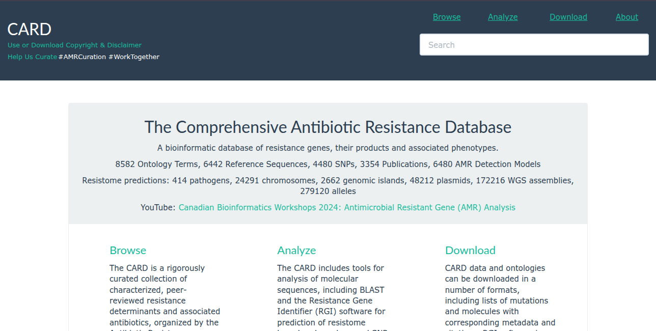 CARD(Comprehensive Antibiotic Resistance Database)は抗菌剤耐性遺伝子やタンパク質及び表現型に関する包括的なデータベース。 Paper: https://academic.oup.com/nar/article/51/D1/D690/6764414?login=false