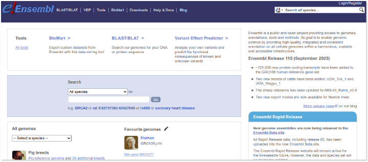 Ensembleはゲノム解読された真核生物を対象に自動アノテーションを行い、データベースとして公開。相同性検索やデータのダウンロードなども可能