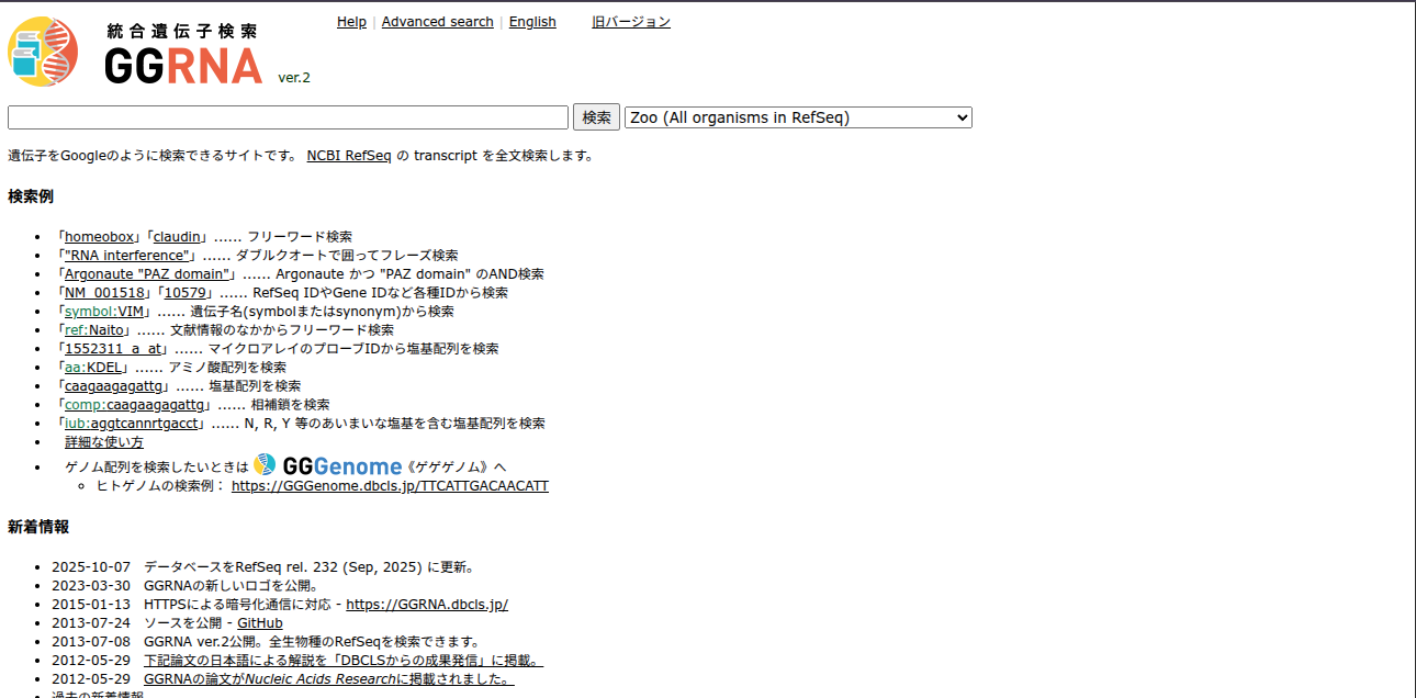 GGRNAは遺伝子をGoogleのように検索できるサイト。NCBI RefSeq の transcript を全文検索可能 GitHub: https://github.com/meso-cacase/GGRNA