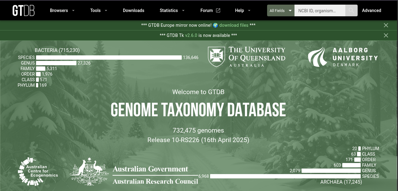 GTDBはBacteriaとArchaeaに属する生物の分類情報を提供するゲノム分類データベース。分類法は普遍的なSingle copy-proteinsから推定した系統推定