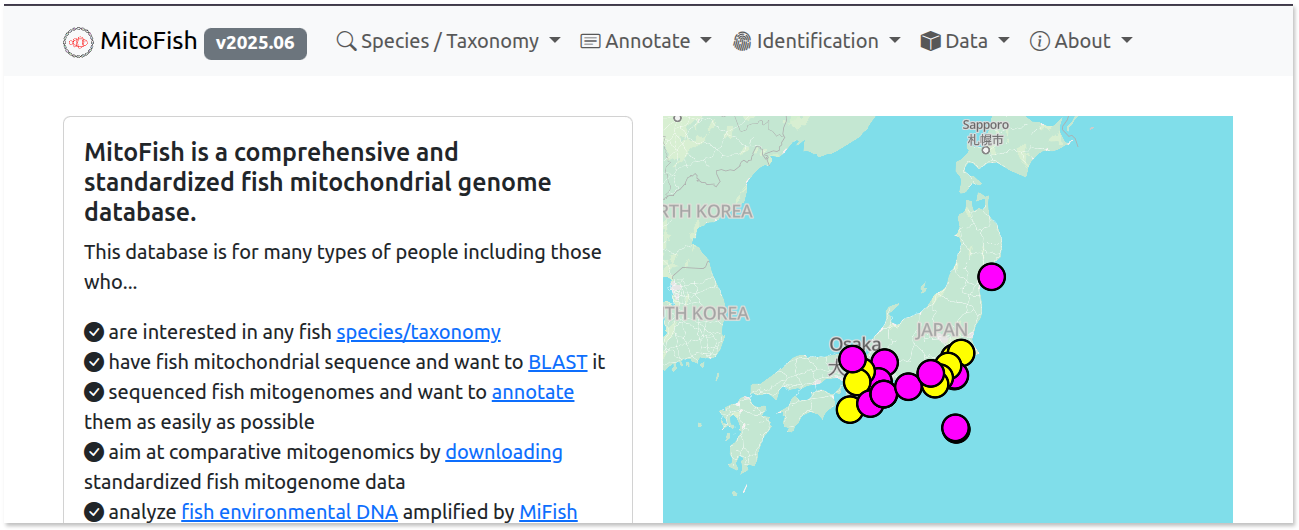 MitoFishは魚類のミトコンドリアゲノム情報を検索可能なデータベース。サイト内でBLASTが可能