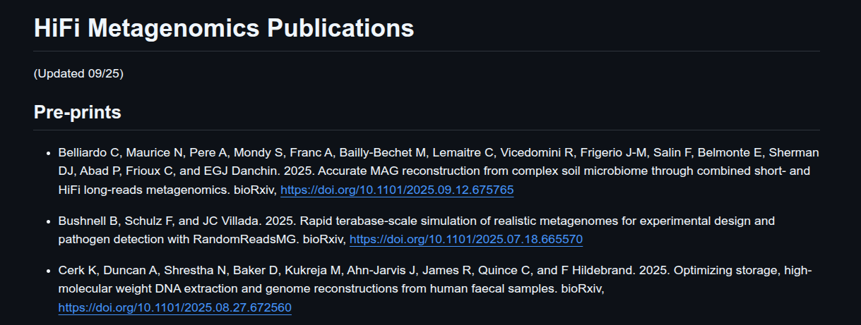 PacBio HiFiシーケンスで生成された、一般公開されているショットガンメタゲノミクスデータセットの情報がまとめられたサイト。SRA-toolkitを使用して配列取得することで利用することができます。