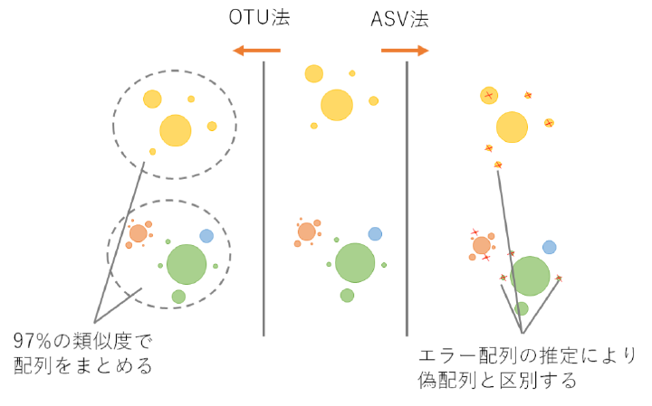 近年、微生物学分野では、生物学的配列をより正確に推定するために、OTU法に代わって ASV法(Amplicon Sequence Variant)が開発されました。