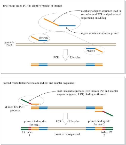 DNAバーコーディングや分子生物学を専攻した方であれば周知の技術になっていますが、デュアルインデックスのライブラリー調整というのは2段階のPCRによって標的のDNA領域を増幅、NGSで解析する前に標的のDNAにサンプルタグ配列を付加後、分析するサンプルを混ぜ合わせる工程を指します(下図)。