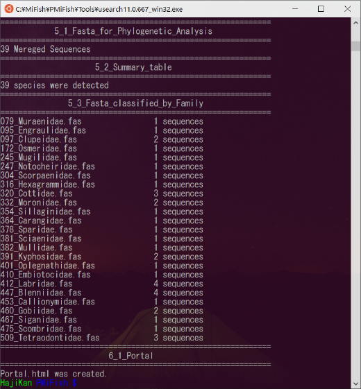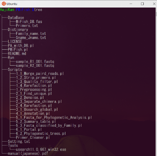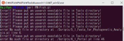 PMiFish は「Tools の中に Usearch11 の実行ファイルがある」前提でスクリプトが書かれているため、実行ファイルがない状態で実行すると「Tools に置いてください」というエラーが出ます。