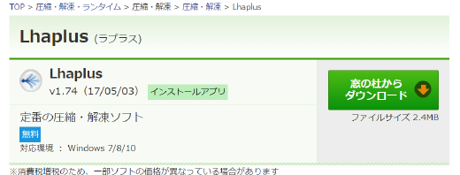 右側の「窓の杜からダウンロード」からファイルを取得し、指示に従って Lhaplus をインストールします。