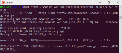 コマンドで Usearch の実行ファイルをダウンロードして解凍します。