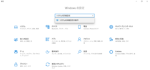 Windows のスタートメニューから「設定」を開き、「システムの詳細設定」を開きます。