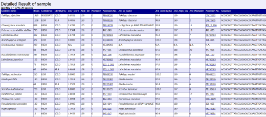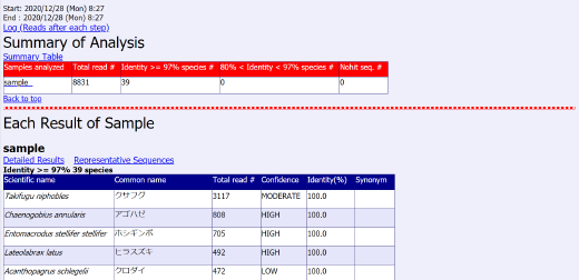 sample_Detail.htmlには、検出された学名、リード数、信頼度、対象配列に対して2番目に類似する種などが HTML 形式で記載されています。