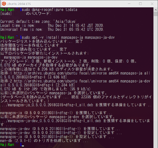 $ sudo apt -y install manpages-ja manpages-ja-dev