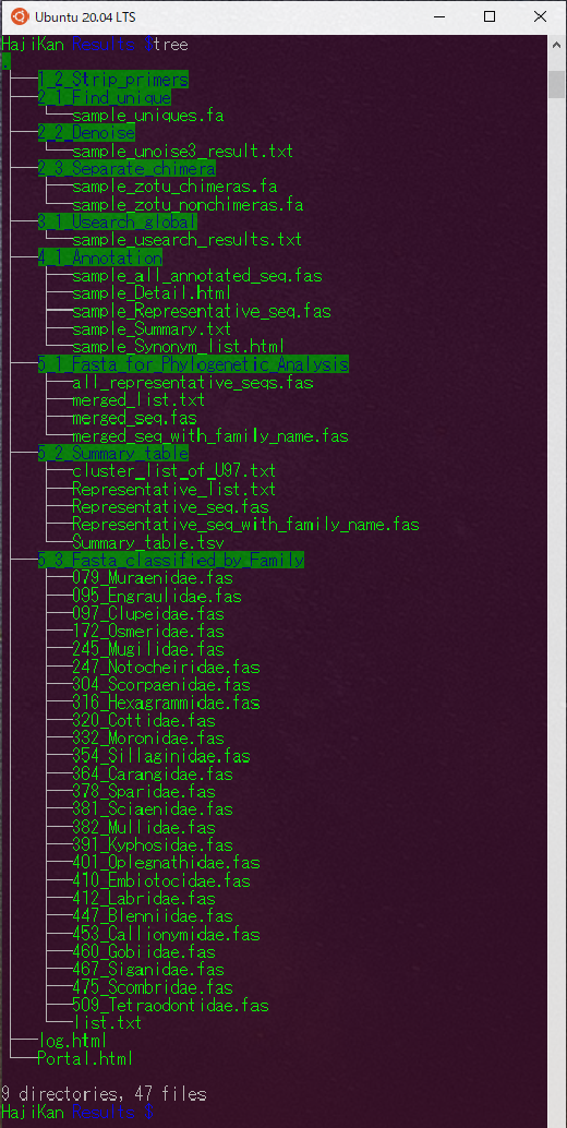 アノテーションとは、データに対して情報を付与することです。このフォルダには、パイプライン処理によって精査された配列に対して、データベースとマッチした種名やその確からしさなどの情報がまとめられています。