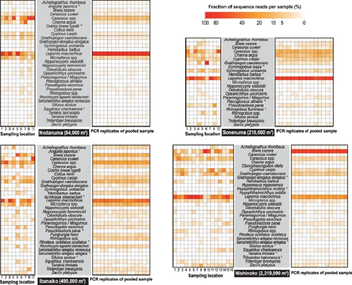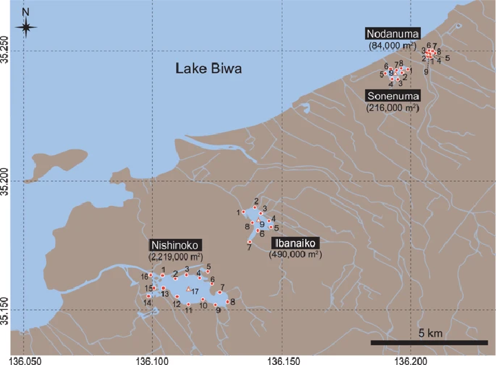 本研究では、MiFish プライマーを用いた環境DNAメタバーコーディングにおいて、琵琶湖周辺に点在する4つの内湖(野田沼、曽根沼、伊庭内湖、西の湖)の沿岸部複数地点で採水を行い、