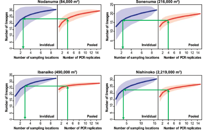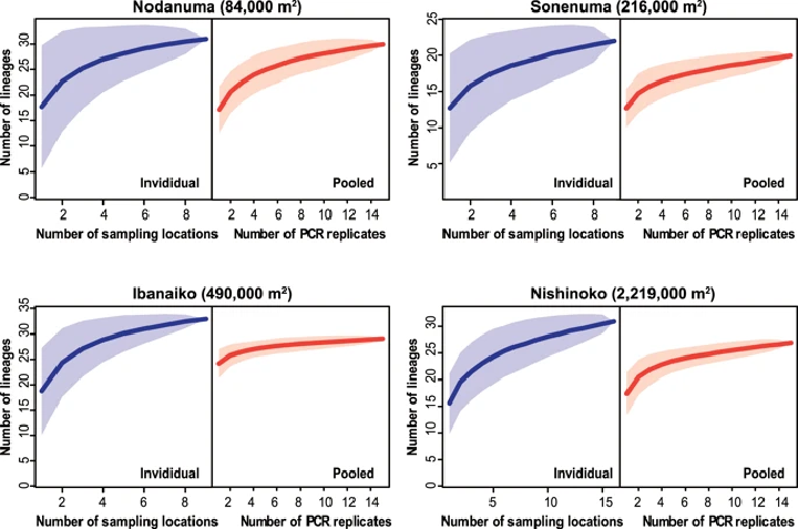 また、信頼区間(影の部分)の幅は、どの湖においても個別サンプルの方が大きいことから、個別サンプルでは1サンプルあたりの検出種数にばらつきが大きいことが分かります。複数地点のサンプルをプールし、1st PCR の繰り返しを設ける方法の方が、検出される種数と種組成がより安定していると言えるでしょう。