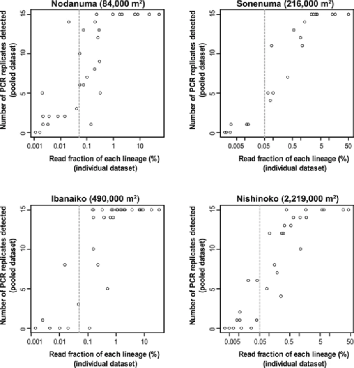 それに対し、湖ごとにサンプルをプールして分析した場合、1st PCR の繰り返し数を15回に設定すると、
