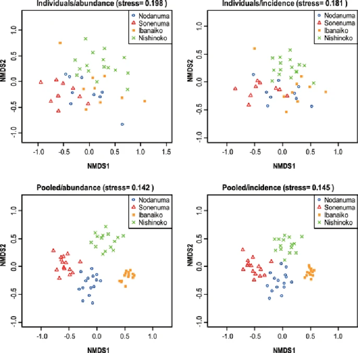 個別サンプルに比べ、プールサンプルでは各内湖ごとに点が集まっており、それぞれの内湖の魚類相の特徴がより明瞭に表れていることが分かります。